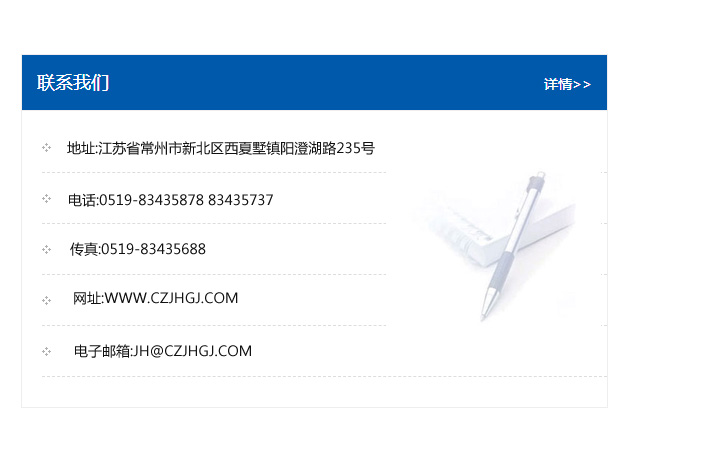 地址:常州市新北區友邦商務大廈1幢16、17層  電話:0519-85101652  傳真:0519-85112595  郵編:213022  網址:www.cz-jiayue_cn.cdseno.com  郵箱:xiajifengaa@163.com